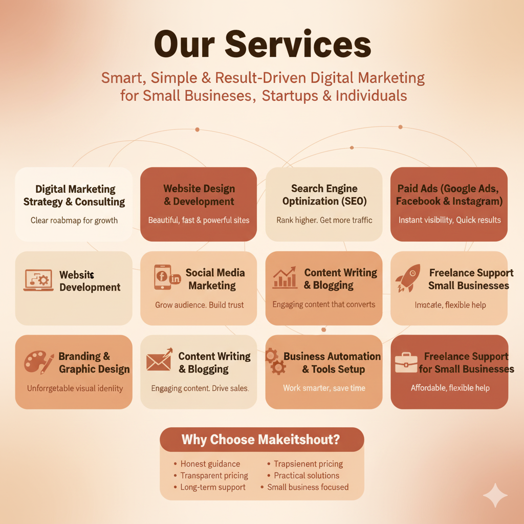 At Makeitshout, we believe that digital marketing doesn’t have to be confusing, expensive, or overwhelming. It should be clear, practical, honest, and designed to help businesses grow — step by step, one smart decision at a time.